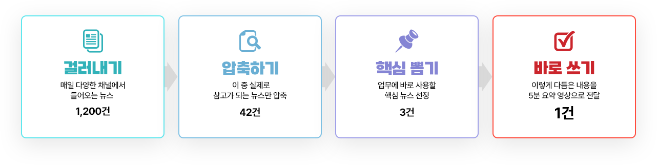 회의 준비, 시장 분석, 트렌드 파악을 위해 소비하는 시간은 평균 150분 > 쏟아지는 정보, 실무에 필요한 1건만 남깁니다.